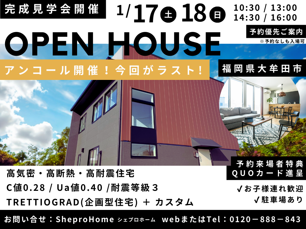 | タイトル | 【大牟田市1/17,18】性能もデザインも譲れない!高性能&最新家電を体感できる完成見学会 |