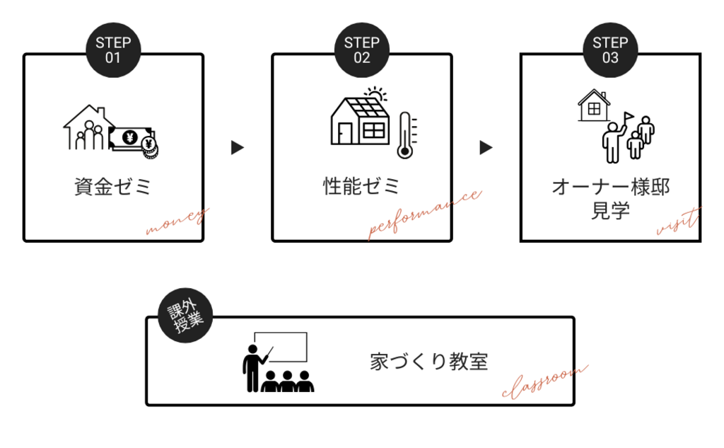 「資金ゼミ」「性能ゼミ」「オーナー様邸見学」の3つのステップを順を追って進めることで、理想の住まいを実現するための知識と準備を整えましょう。