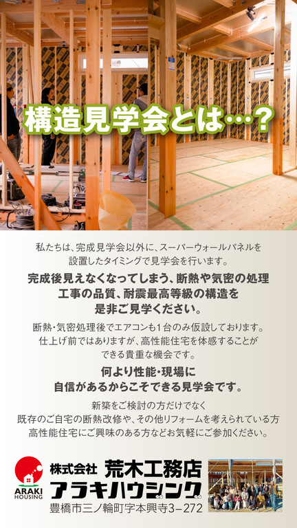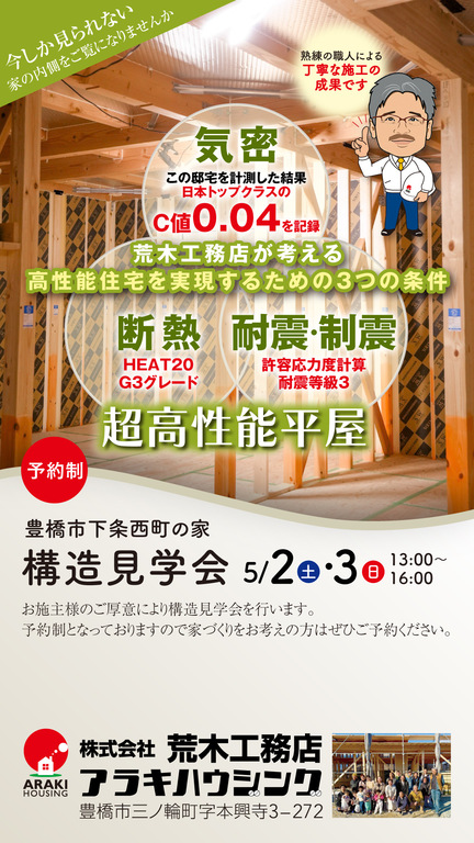| タイトル | 【構造見学会】C値全国最高峰0.04の超高性能平屋現場見学会 |