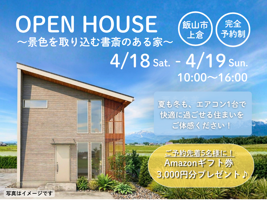 | タイトル | 【飯山市上倉】~景色を取り込む書斎のある家~完成見学会 |