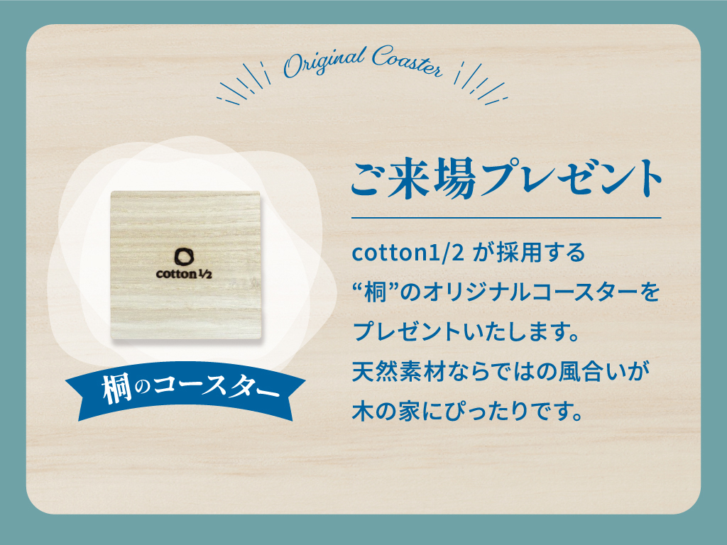 「50年後も快適なあたたかい木の家見学会」では、ご来場いただいた方にcotton1/2オリジナルの桐のコースターをプレゼントいたします。天然素材ならではのさらりとした風合いが心地良いコースターです。