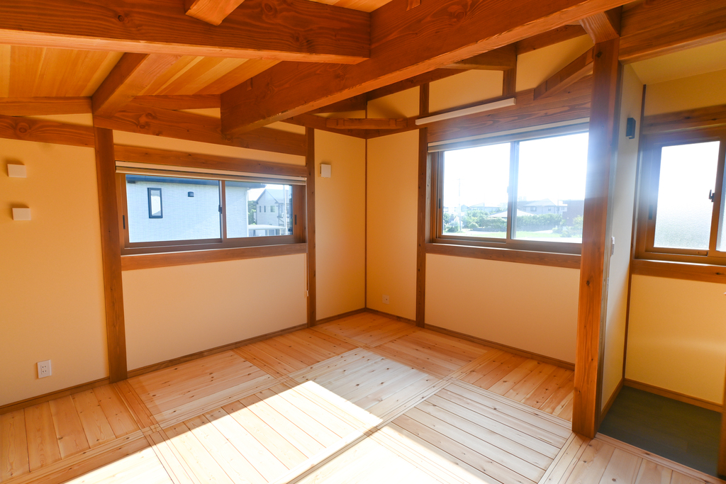 2階に上がると広がるこのファミリースペースは、木の温もりに包まれた“もうひとつのリビング”のような心地よさがあります。床・天井・柱すべてに木材を贅沢に使い、家全体がふわりと優しい香りで満たされる、癒しの空間です。