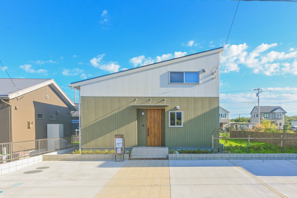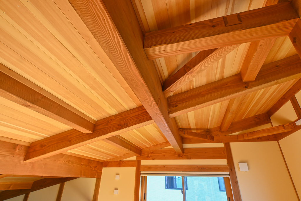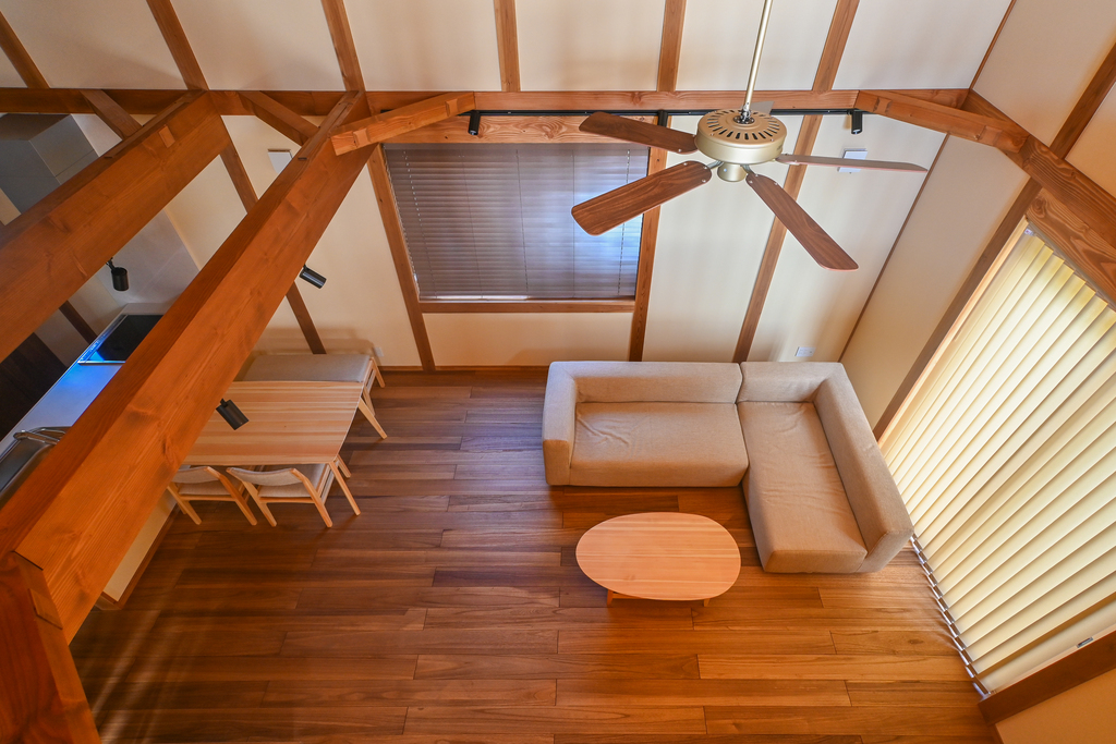 天井を高く見せる勾配デザインと、見せ梁の組み合わせが印象的。のびやかな空間になっていて、実際よりも広々と感じられます。家族がゆったりくつろげる“余白”がしっかり確保されています。