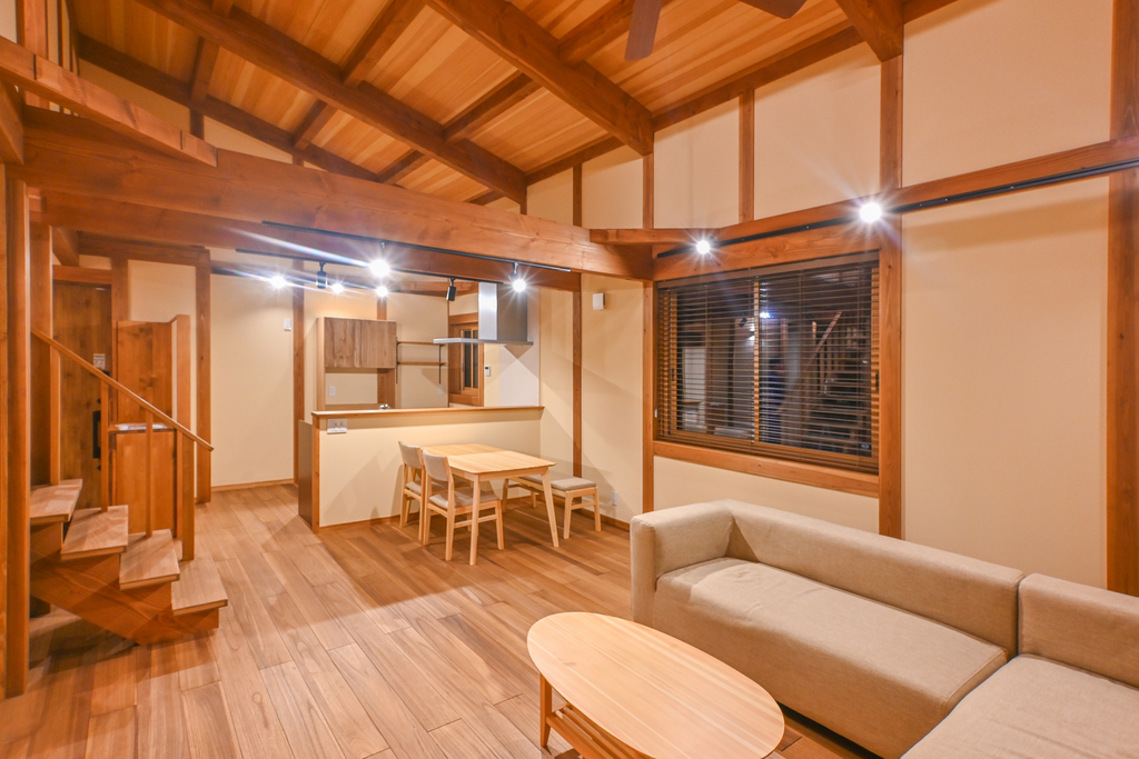 天井・梁・床まで、ふんだんに使われた木がやわらかい雰囲気をつくり、入った瞬間に落ち着く空間に仕上がっています。天然木ならではの質感と香りが、家全体を優しく包み込んでいます。