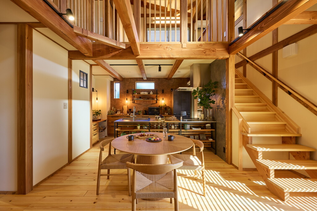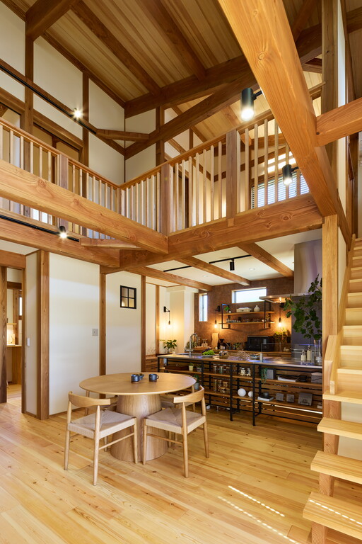 天井の吹き抜けがその広がりを強調し家族の集う場が一層開放的に。