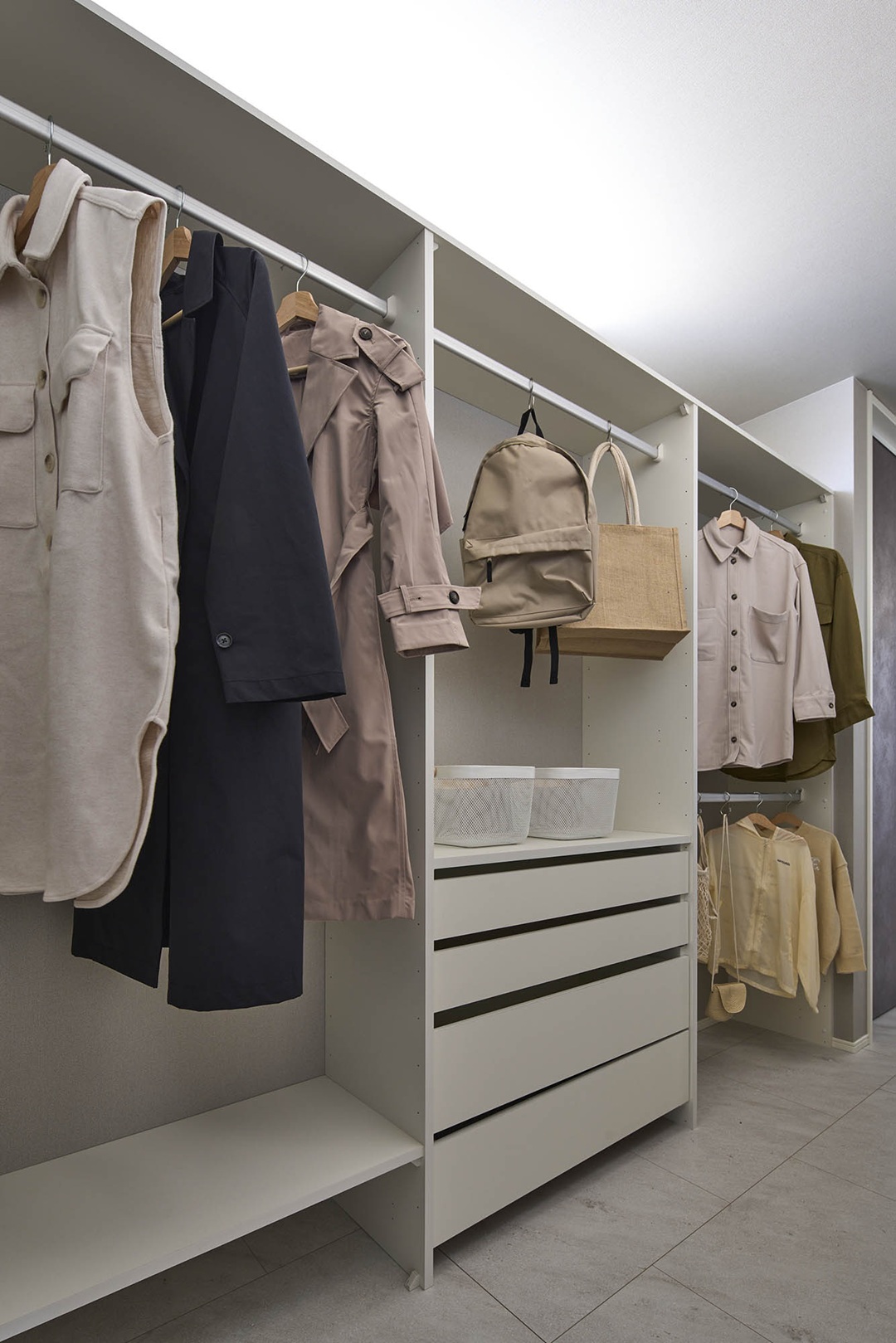 ランドリールームからも玄関からも行き来しやすいファミリークローゼットは、洗濯し終えた衣服を片付けるにも、帰宅してすぐにコート類を片付けるにも便利です。