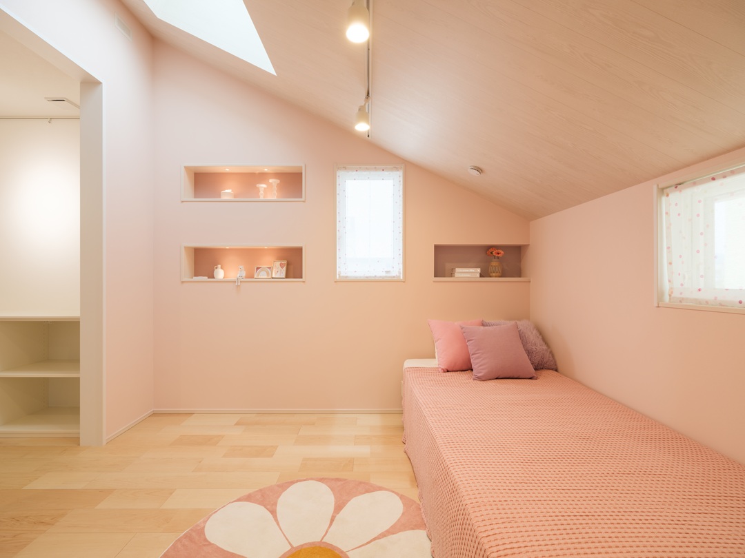 1階下屋洋室は勾配天井を採用し、縦の空間が広がり開放的に✨