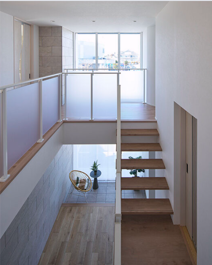 吹抜とスケルトン階段の奥に広がるインナーテラス