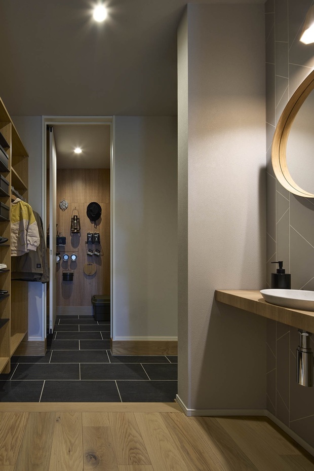 玄関横に洗面を配置し、帰宅後すぐに手洗いうがいが可能。