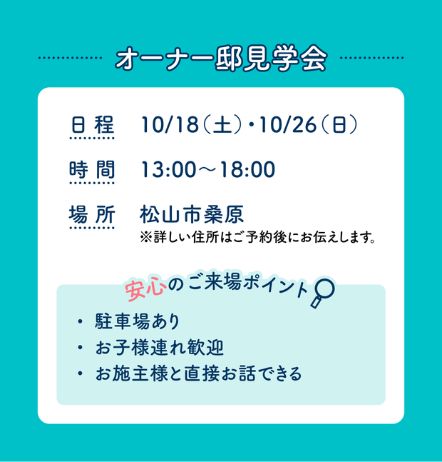 | タイトル | 松山展示場 キッチンがおしゃれな広々平屋 オーナー様邸見学会 |