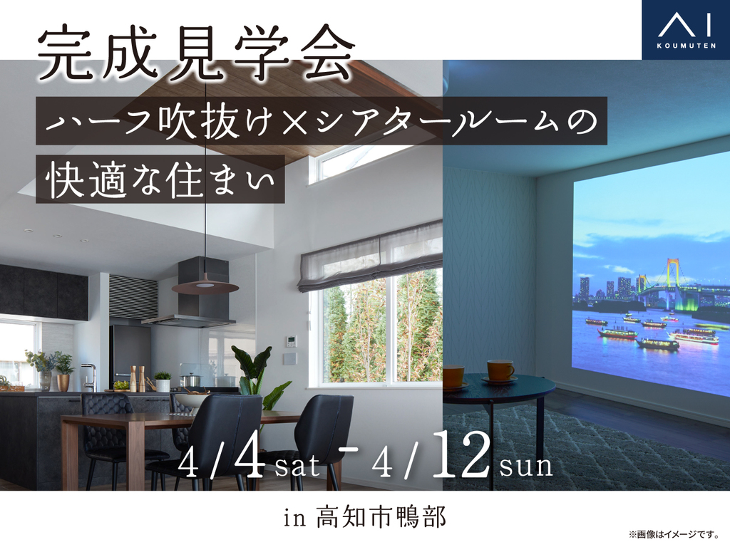 | タイトル | アイパーク高知 《高知市鴨部》ハーフ吹抜け×シアタールームの快適な住まい 完成見学会 |