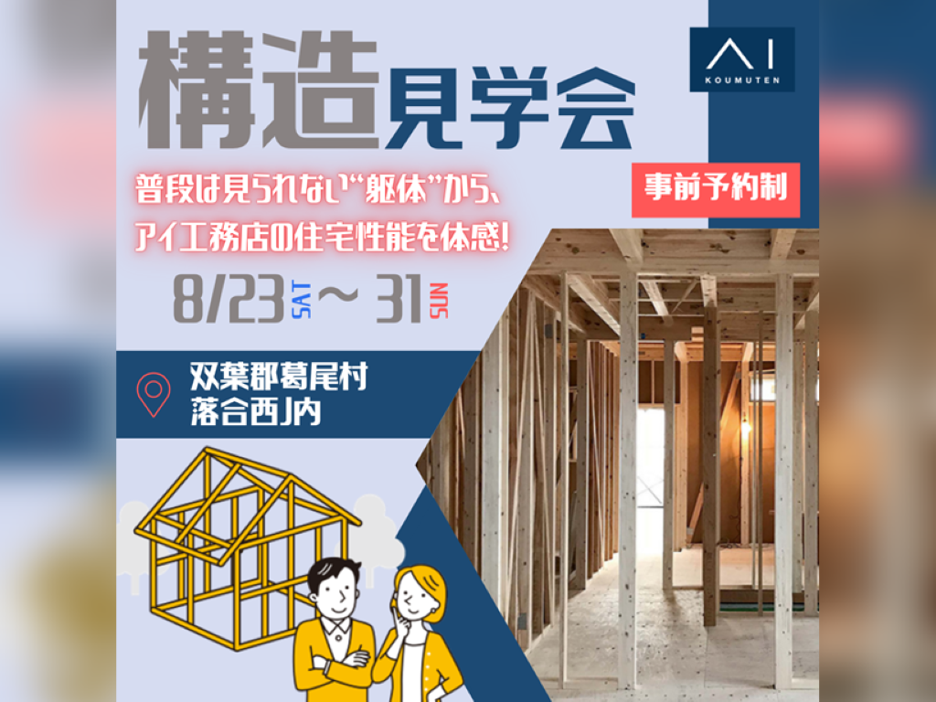 アイ工務店を構造からご見学頂き、さらに完成見学会にも足を運んで頂くことで、安心・納得の家づくりに繋がります!当WEB予約ページよりお気軽にお申込みを♪