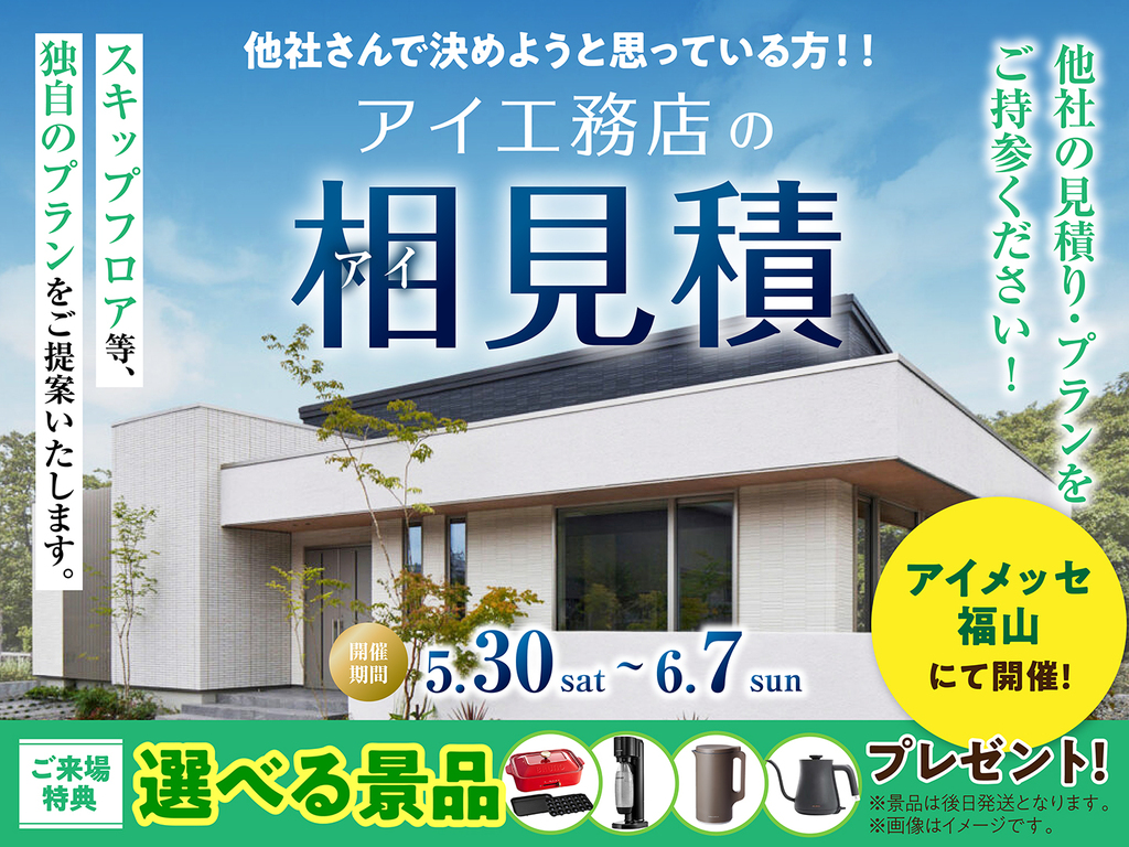 | タイトル | アイメッセ福山 アイ工務店のアイ見積りキャンペーン |