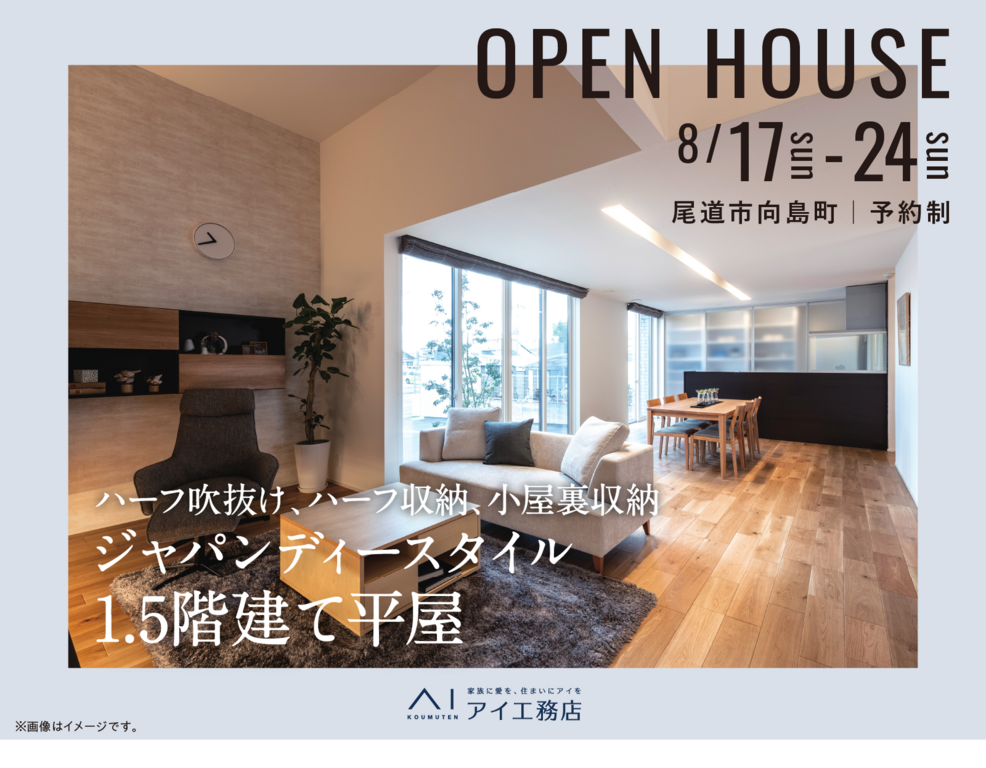 尾道展示場 〈向島町〉ハーフ吹抜け、ハーフ収納、小屋裏収納、ジャパンディースタイル1.5階建て平屋