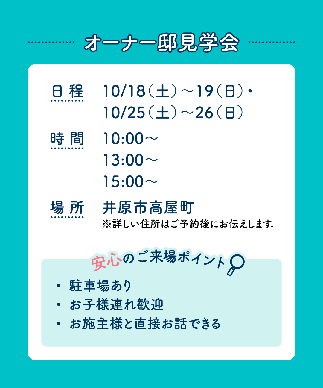 アイ工務店の『住まいの勉強会』は、オーナー邸・完成見学会・モデルハウスを見学できる年2回の期間限定特別イベントです!