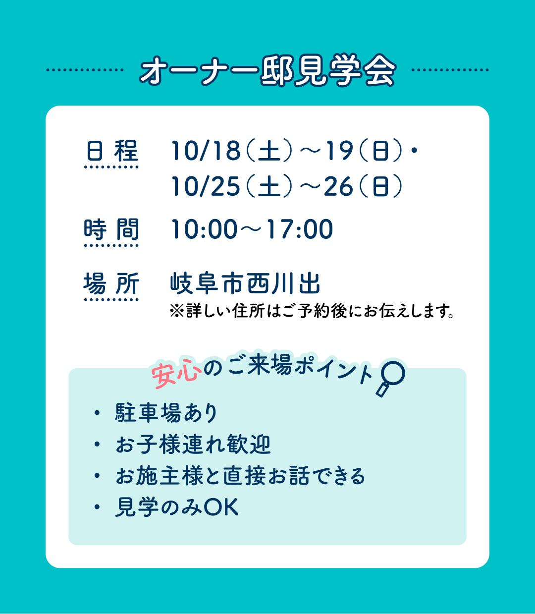 当日は岐阜展示場へお越しいただき、現地にご案内させていただきます。