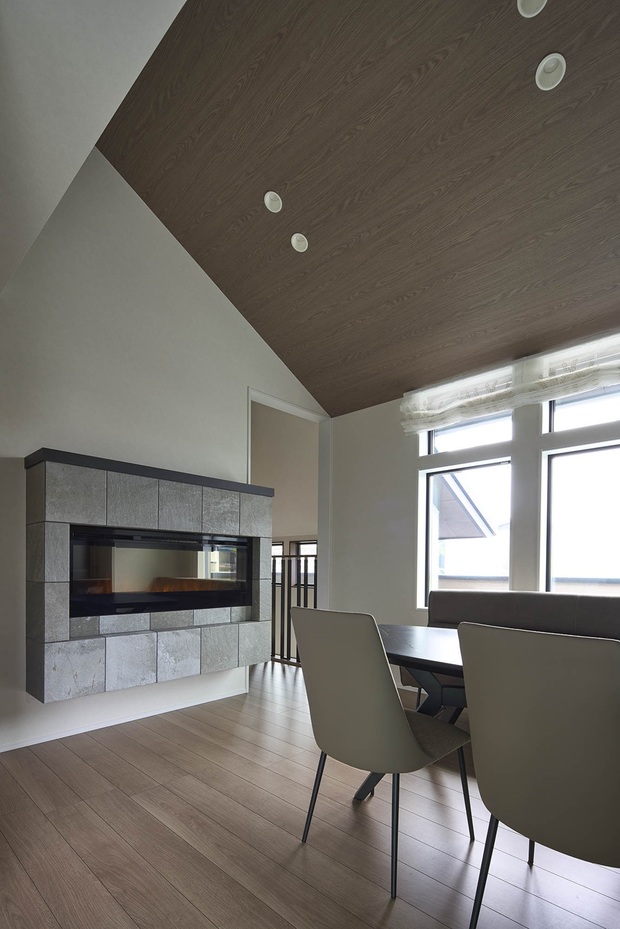 勾配天井の最大の魅力は、天井が高くなることで開放感が生まれ、空間が広く感じられることです。家族が集まるリビングが、ゆったりとしたくつろぎ空間になっています✨