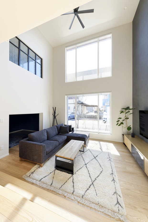 大開口の窓とハーフ吹き抜けがつくる、光と風が心地よく巡るLDK。