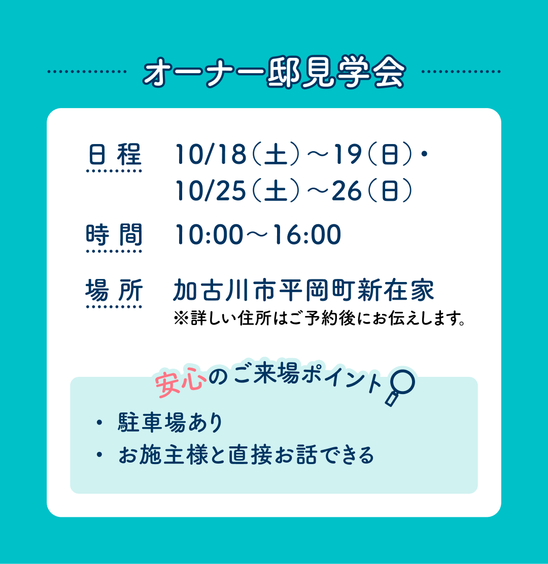 私たちのこだわりの詰まった住まいへぜひ見学に来てください。