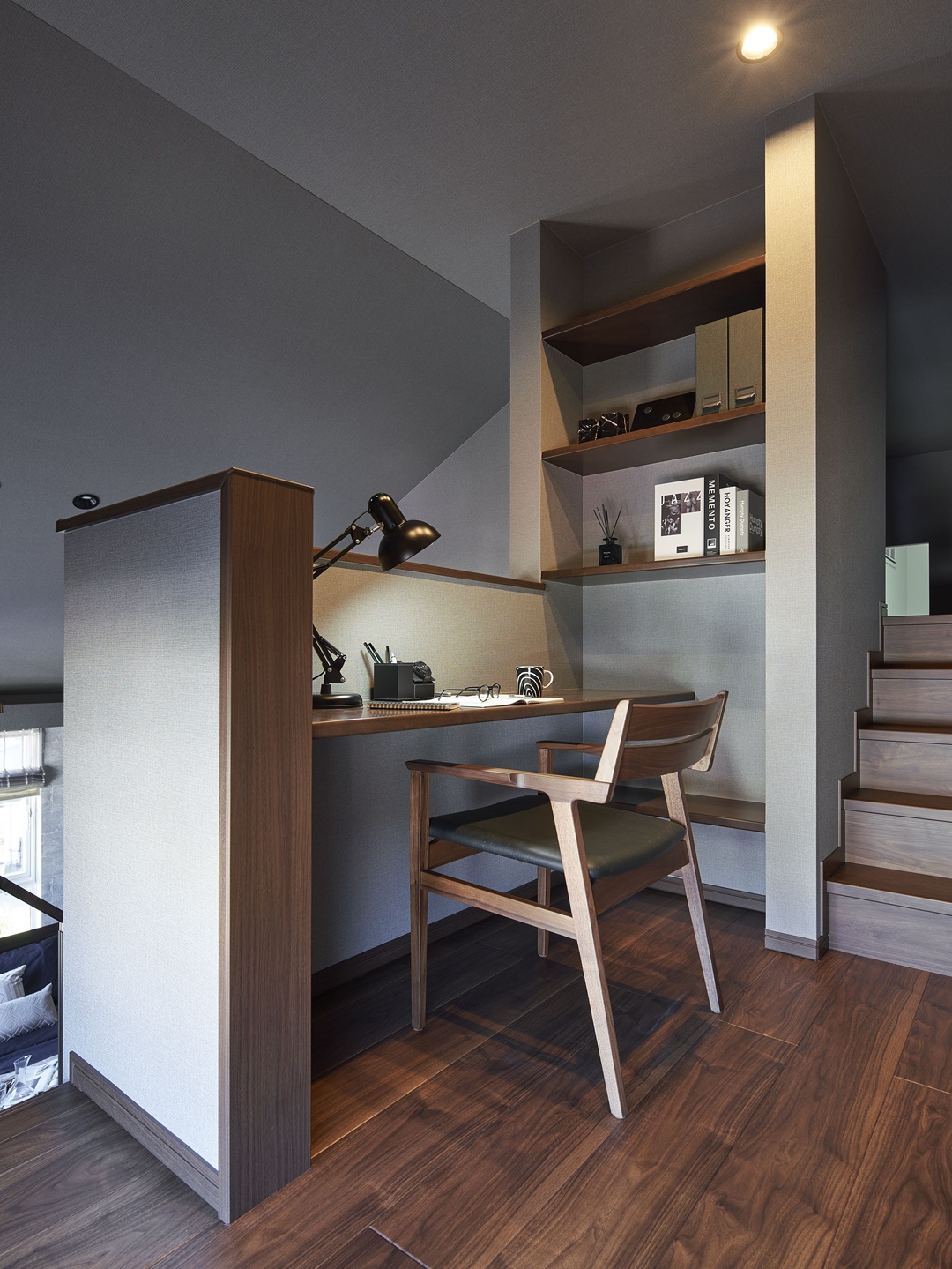 ちょっとしたワークや読書にぴったりな、階段下を活用した小さな書斎スペース。おこもり感のあるヌック風の空間は、毎日に便利な居場所となります♪