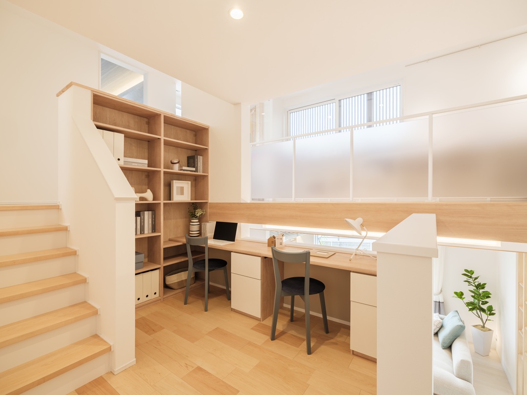 リビングから少し離れた1.5階に設けたスペースは、仕事や勉強に集中できる家族共有の場。程よい距離感がありながら気配を感じられる、安心のワーク空間です✏
