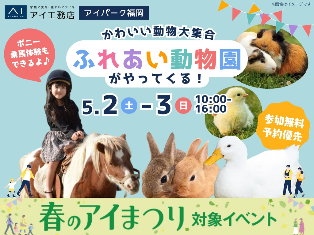 | タイトル | アイパーク福岡(複合型住宅展示場) かわいい動物大集合🐤ふれあい動物園がやってくる! |