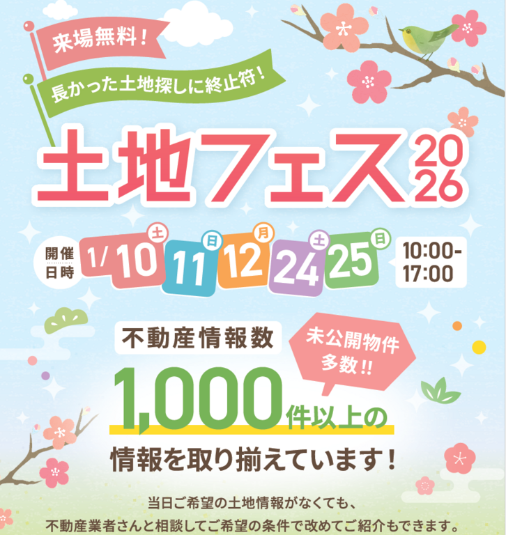 この機会を逃すと、理想の土地を見つけるチャンスを失ってしまうかもしれません。ぜひ「土地フェス2026」にご参加いただき、未来の住まいを一緒に考えましょう。