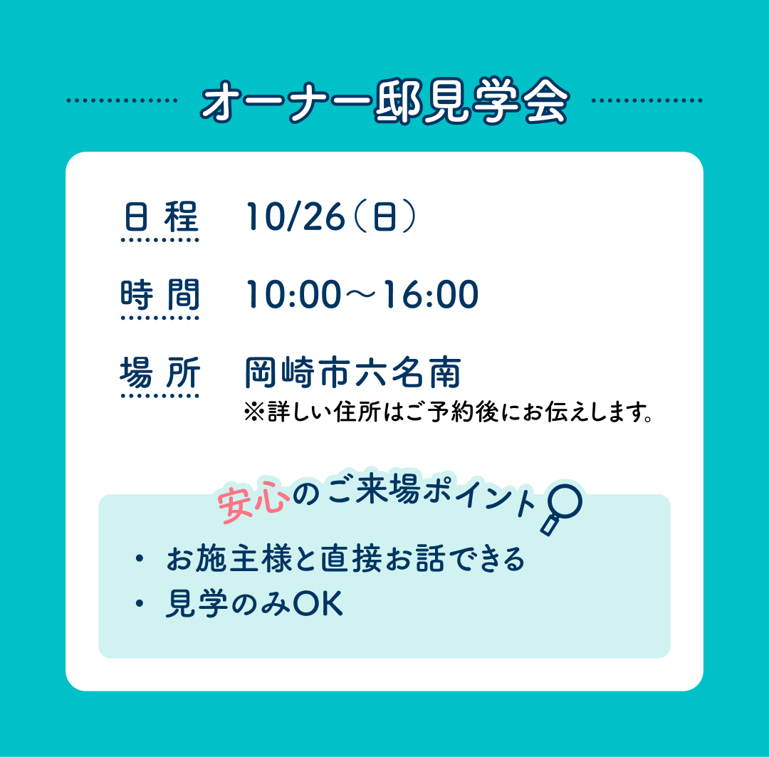 当日は岡崎西第二展示場へお越しいただき、現地にご案内させていただきます。