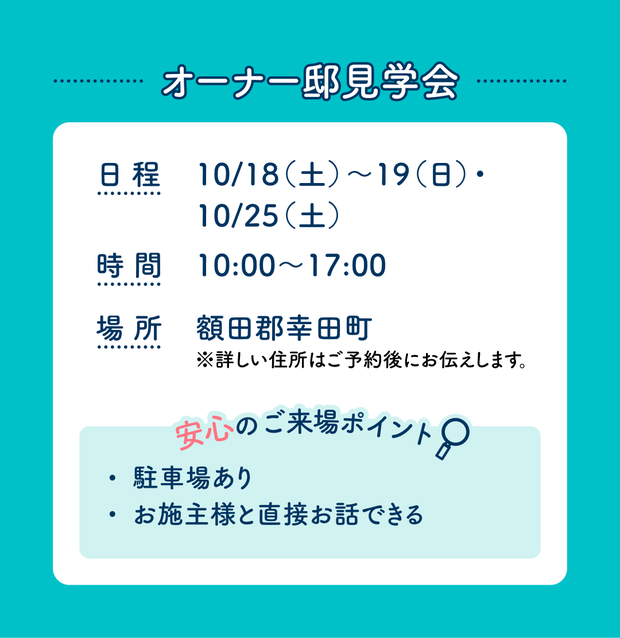 | タイトル | 岡崎西展示場 カーテンのいらない開放的な家 オーナー様邸見学会 |