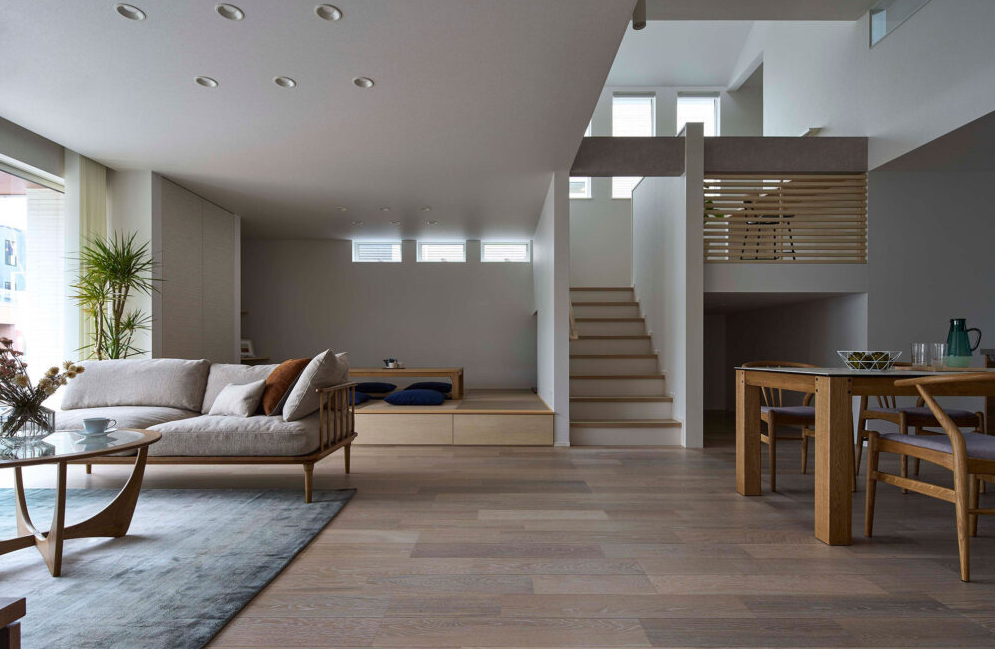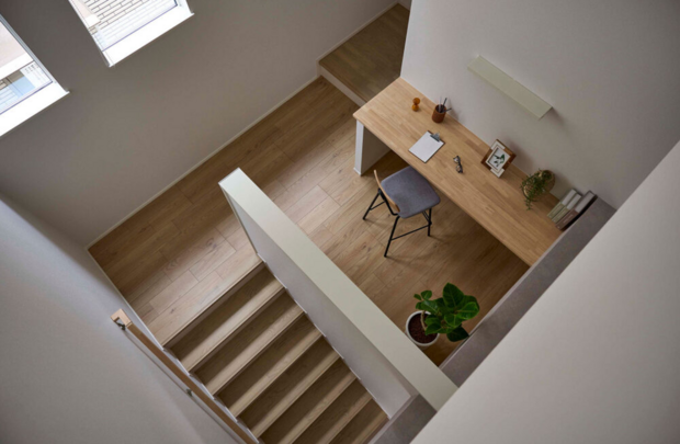 リビング上部の大きな吹抜けが光と風を取り込み、家全体を明るく開放的な空間に。