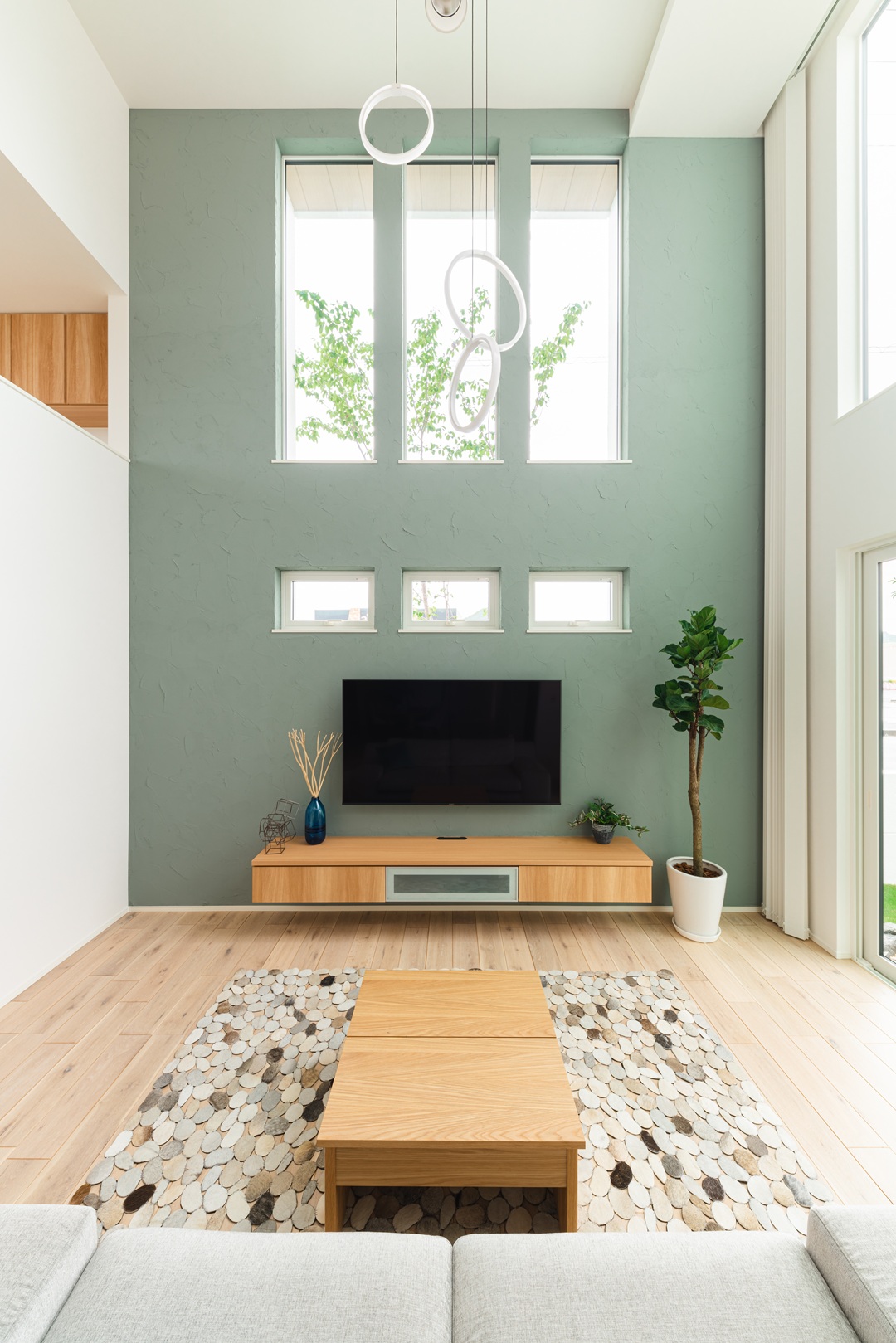 天井まで広がる吹抜けが光と風を招く、開放感たっぷりのリビング。家族が自然と集まり、会話が弾む心地よい空間です。上下階のつながりも感じられ、家中にぬくもりが広がります。