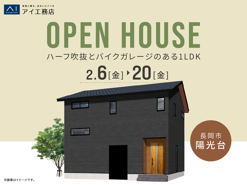 | タイトル | 長岡展示場 《長岡市陽光台》ハーフ吹抜とバイクガレージのある1LDK 完成見学会 |