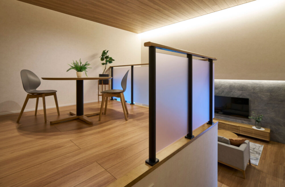 ワンフロアの平屋にスキップフロアを設けることで、高さの変化による広がりと楽しさを演出。家族の居場所が増える快適な住まいです。
