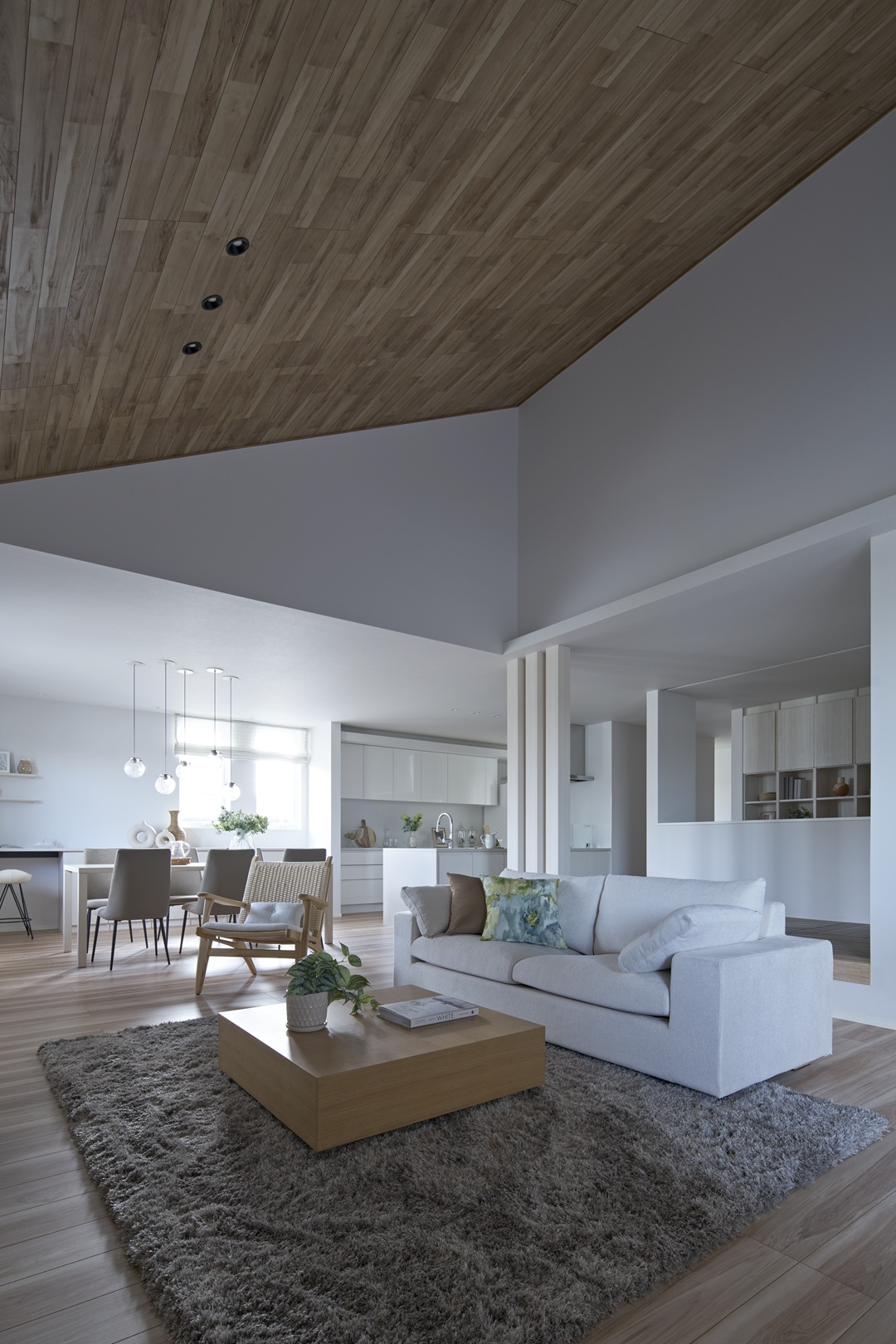 勾配天井にすることで、平屋でありながら縦にも空間が広がり開放的な空間に。