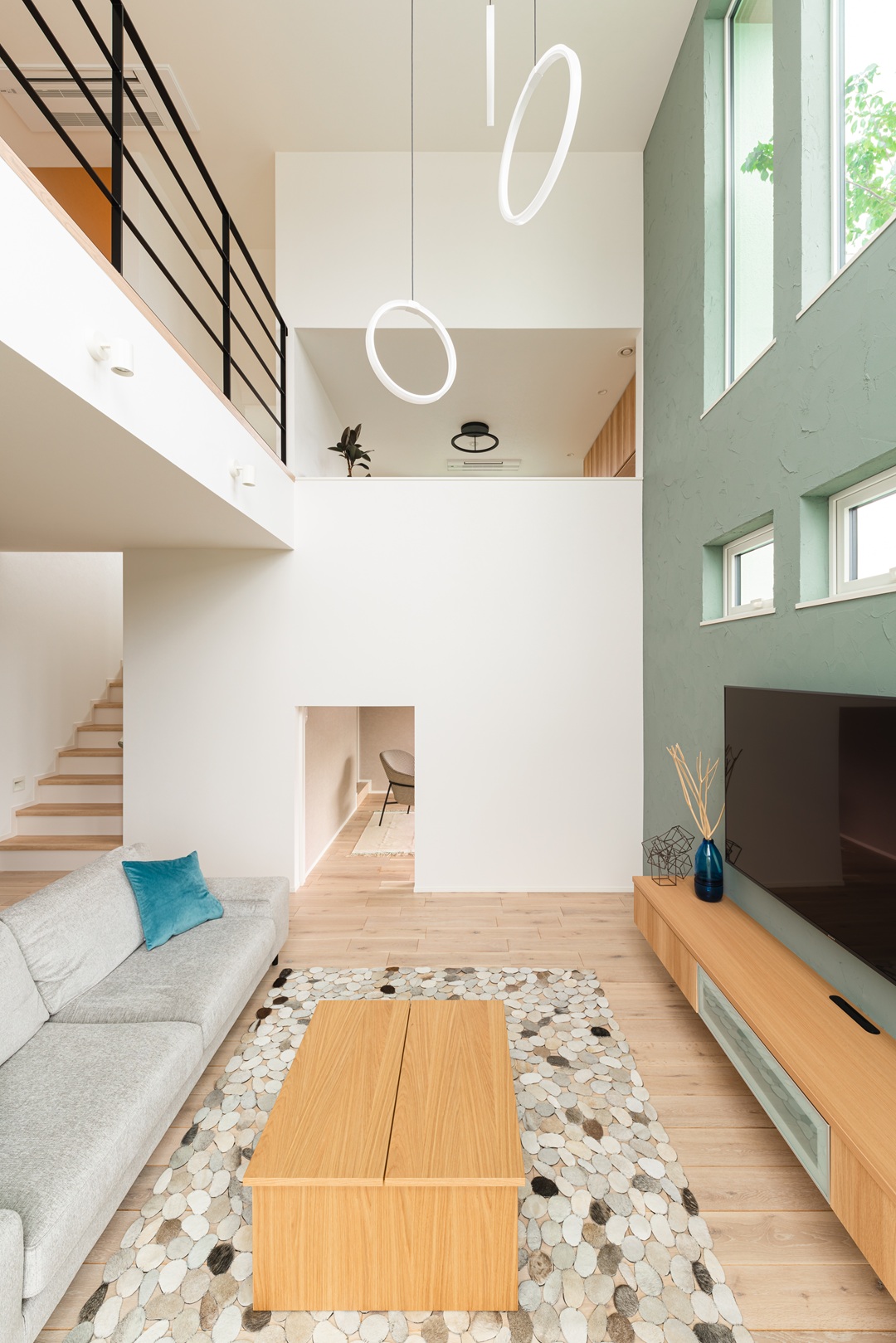 リビングに採用した“ハーフ吹き抜け”は、ほどよい高さで開放感を演出しながら、冷暖房効率や暮らしやすさにも配慮した設計です。
