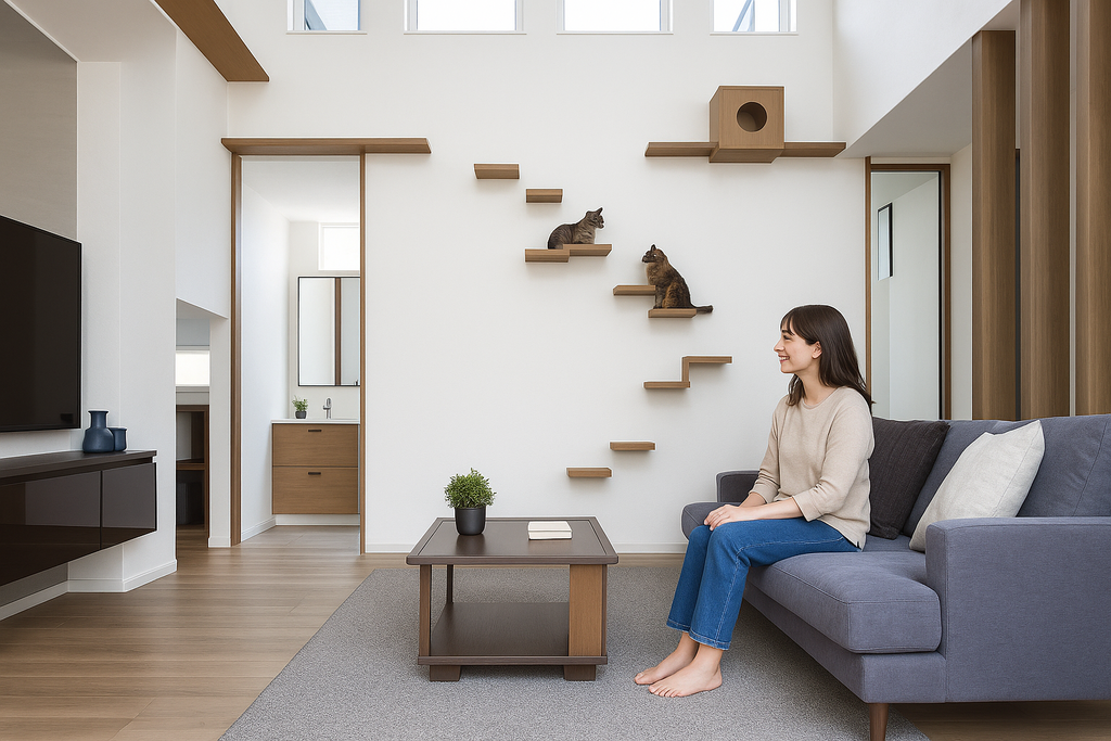 また、キャットウォーク等を利用して日向ぼっこしている猫ちゃんを眺めたり、登った先でくつろいでいる猫ちゃんとソファにいながら自然と目が合うような、そんなちょっとした幸せを演出する最適な間取りをご提案♪
