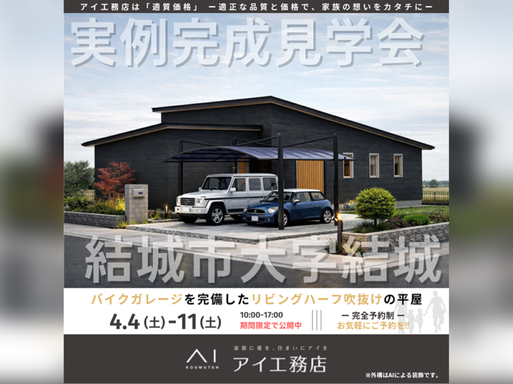 茨木県結城市大字結城にアイ工務店の新築注文住宅【バイクガレージを完備したリビングハーフ吹抜けの平屋】が完成しました。