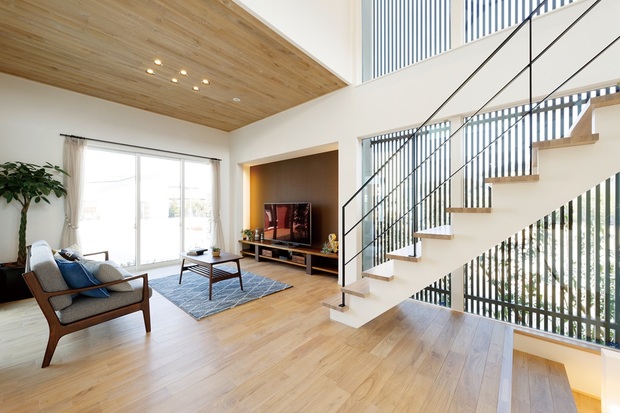 オープン階段と大開口の吹き抜けによって縦方向に広がりが生まれ、明るく開放的な空間に。