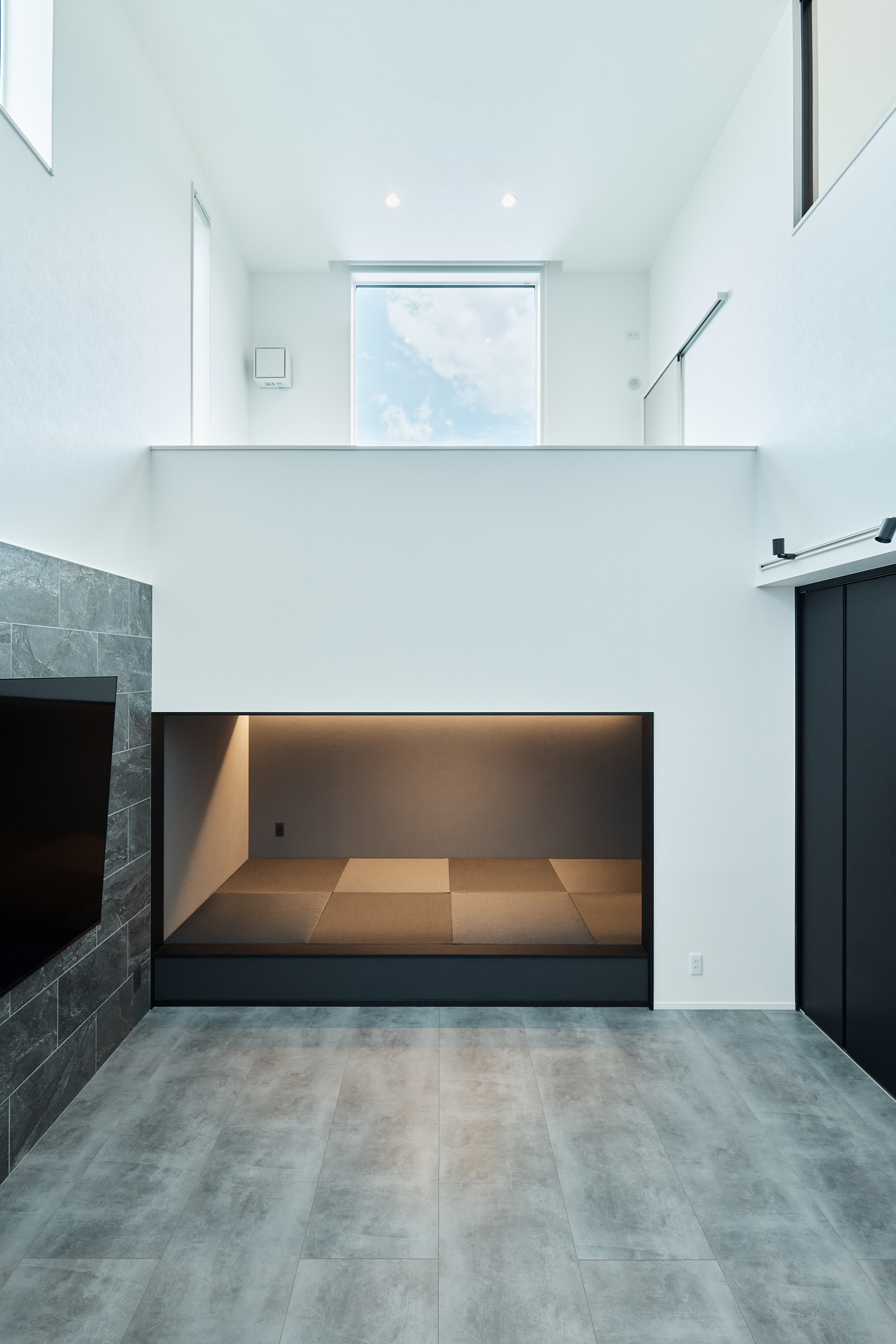 ハーフ収納やスキップフロア、シアター収納を組み合わせることで、縦の空間を活用し、開放感のあるリビングを演出。