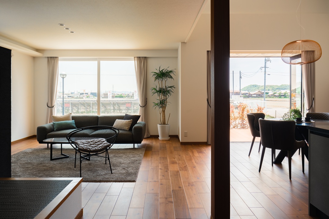 庭がつながる小上がりのタタミコーナー付きのLDKは、開放感あふれる空間です。