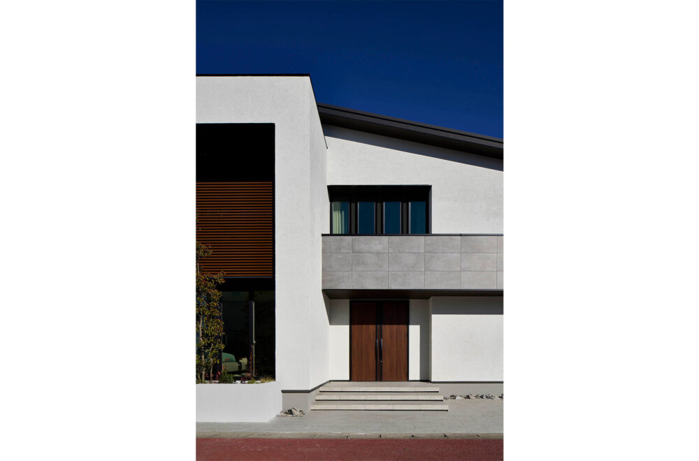 玄関上の大判プレセットタイルや、2階バルコニーのルーバーがアクセントとなり、上質感を際立たせます。