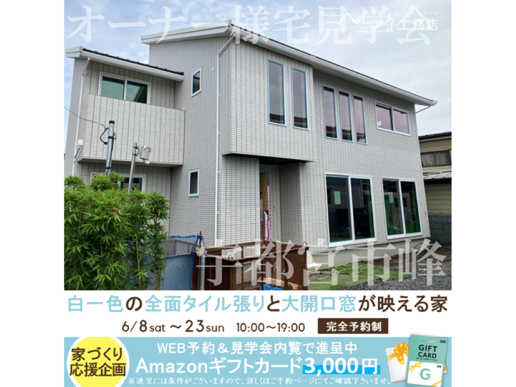 栃木県宇都宮市峰にてアイ工務店のオーナー様宅【白一色の全面タイル張りと大開口窓が映える家】の見学会を開催いたします。