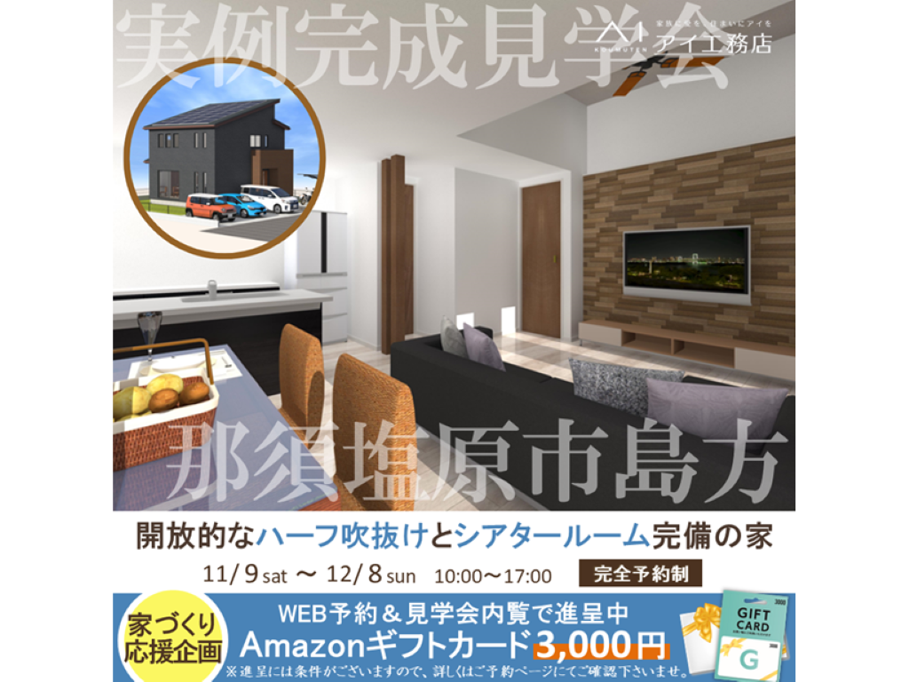 栃木県那須塩原市島方にアイ工務店の新築注文住宅【開放的なハーフ吹抜けとシアタールーム完備の家】が完成しました。