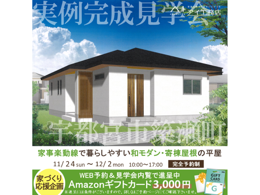 宇都宮市簗瀬町にアイ工務店の新築注文住宅【家事ラク動線で暮らしやすい和モダン・寄棟屋根の平屋】が完成しました。