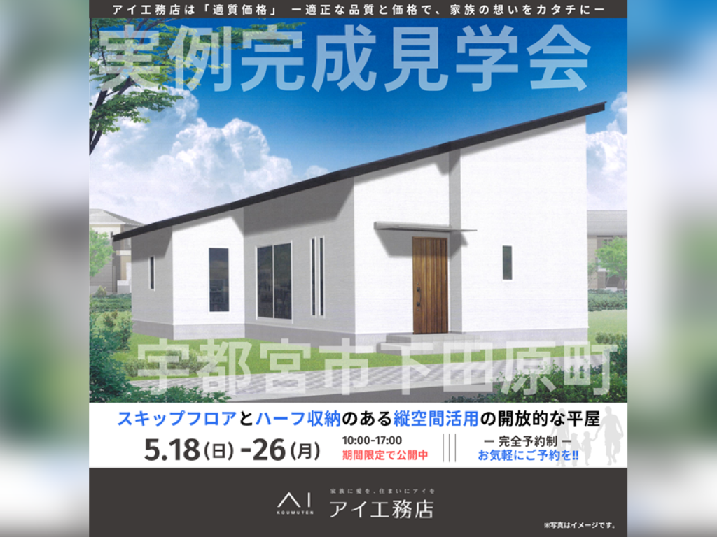 栃木県宇都宮市下田原町にアイ工務店の新築注文住宅【スキップフロアとハーフ収納のある縦空間活用の開放的な平屋】が完成しました。