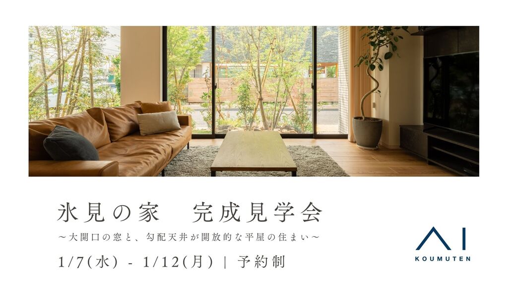 氷見市にて幅3.3m×高さ2.4mの大開口の窓と勾配天井のある解放感が魅力的な、平屋の住まいの完成見学会を開催いたします。