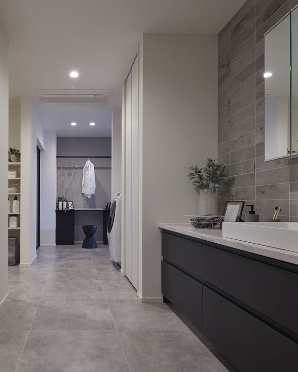玄関からはシューズクローゼット経由で水回りへ直行できる動線を採用。ファミリークローゼットやパントリー、幅の広い洗面台や独立したランドリーにガス衣類乾燥機もあり、家事楽な暮らしが実現できそうです。