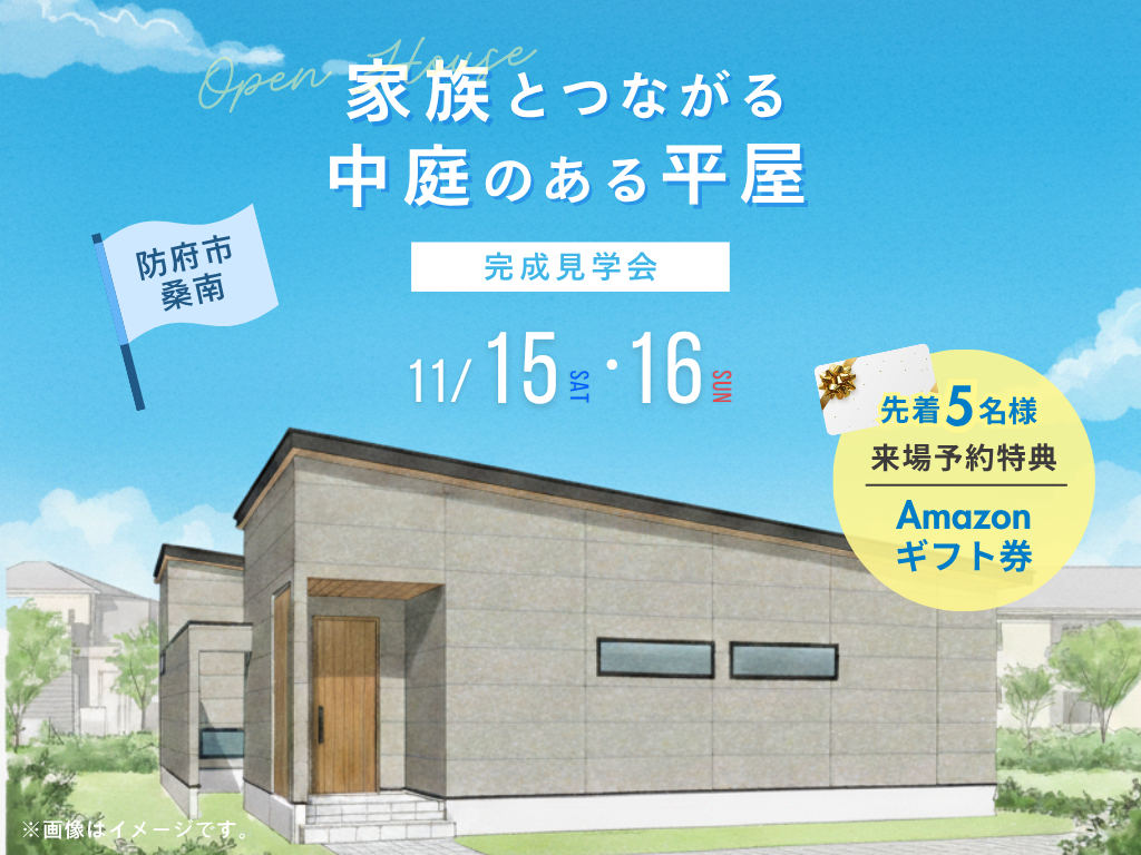 | タイトル | 【完成見学会】家族とつながる中庭のある平屋 |