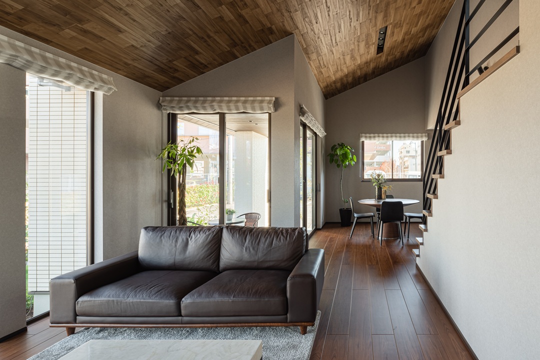 勾配天井にすることで、縦の空間が広がり、のびやかで開放的なLDKが実現しました。