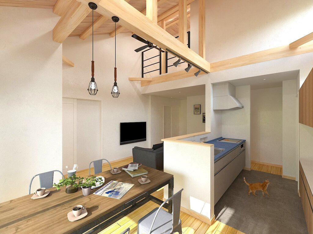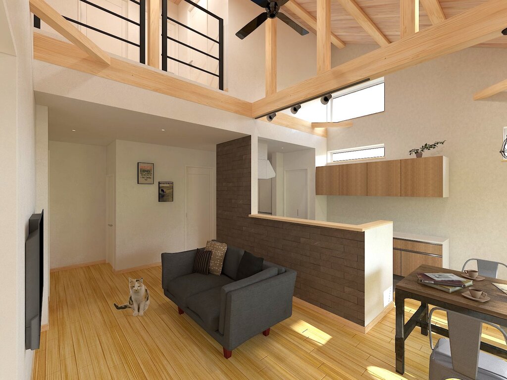 梁(はり)を活かしたキャットウォークや見下ろせる拭き抜けリビングで、猫ちゃんも家族ものびのびと過ごせる空間です。